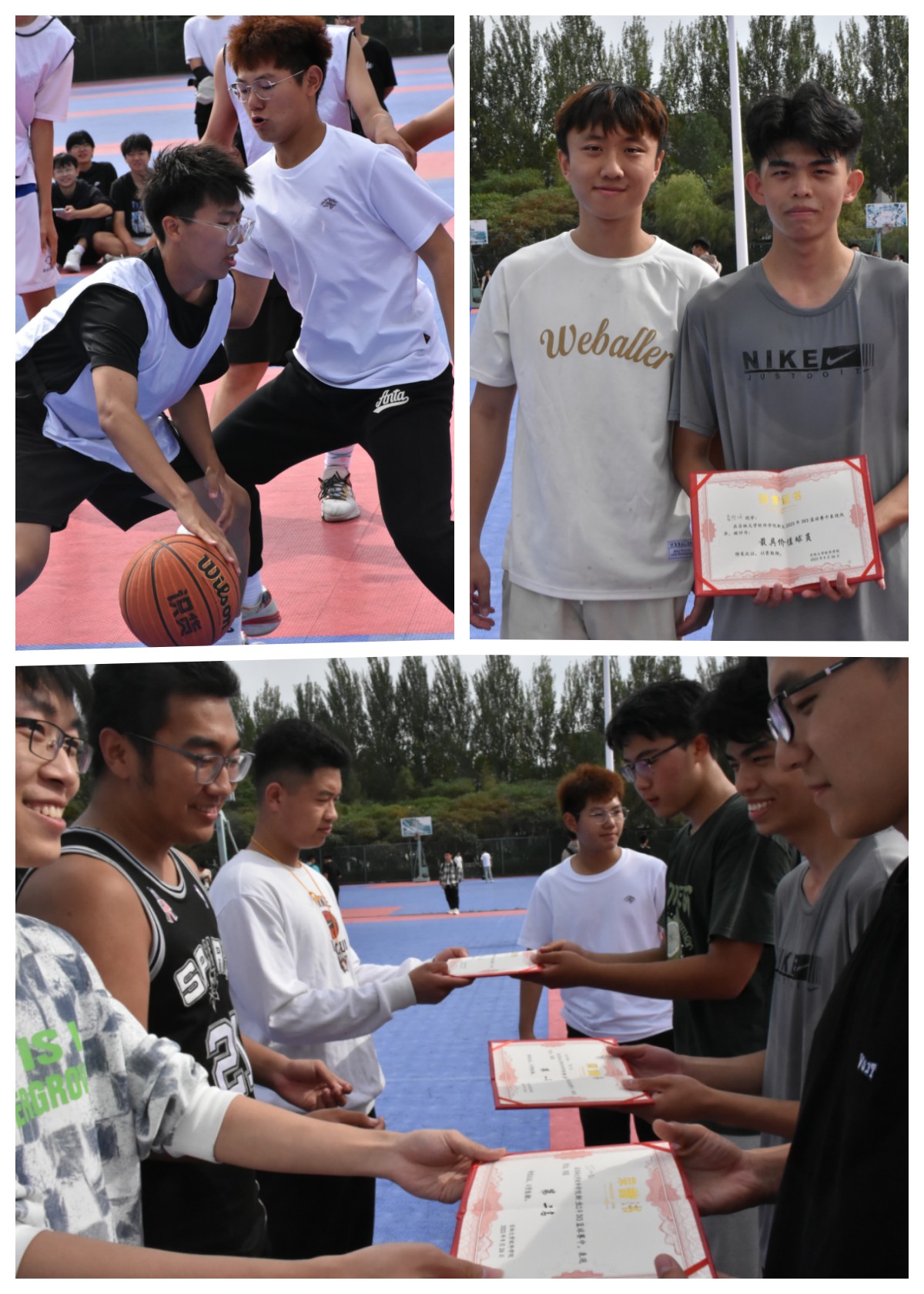 经过前期报名,共有九支队伍参与本次比赛,他们刻苦训练,主动磨合,积极备战,展现出了饱满的参赛热情和斗志昂扬的精神面貌。正式比赛于9月19日在中心校区篮球场拉开帷幕,本次新生篮球赛采取车轮战的赛制,累计获胜场次最多的队伍即为冠军。比赛过程中,各队在球场上展开激烈的角逐,同学们化身运动健将,熟练地抢球、断球、防守,并找准时机精准投球,在篮球场上挥洒汗水,彼此之间的默契度也越来越高。在“吉吉bond队”与“暴龙队”的对阵中,双方队员都不甘示弱,奋勇争先,展现出了高水平的篮球技巧与团队意识,将比赛推向一个又一个高潮,充分凸显出了竞技体育的魅力。其他参赛队伍也齐心协力,勇往直前,他们凭借快速的进攻、潇洒的投篮、准确的抢断、强大的防守,赢得了场外观众们的阵阵掌声与热烈的欢呼。