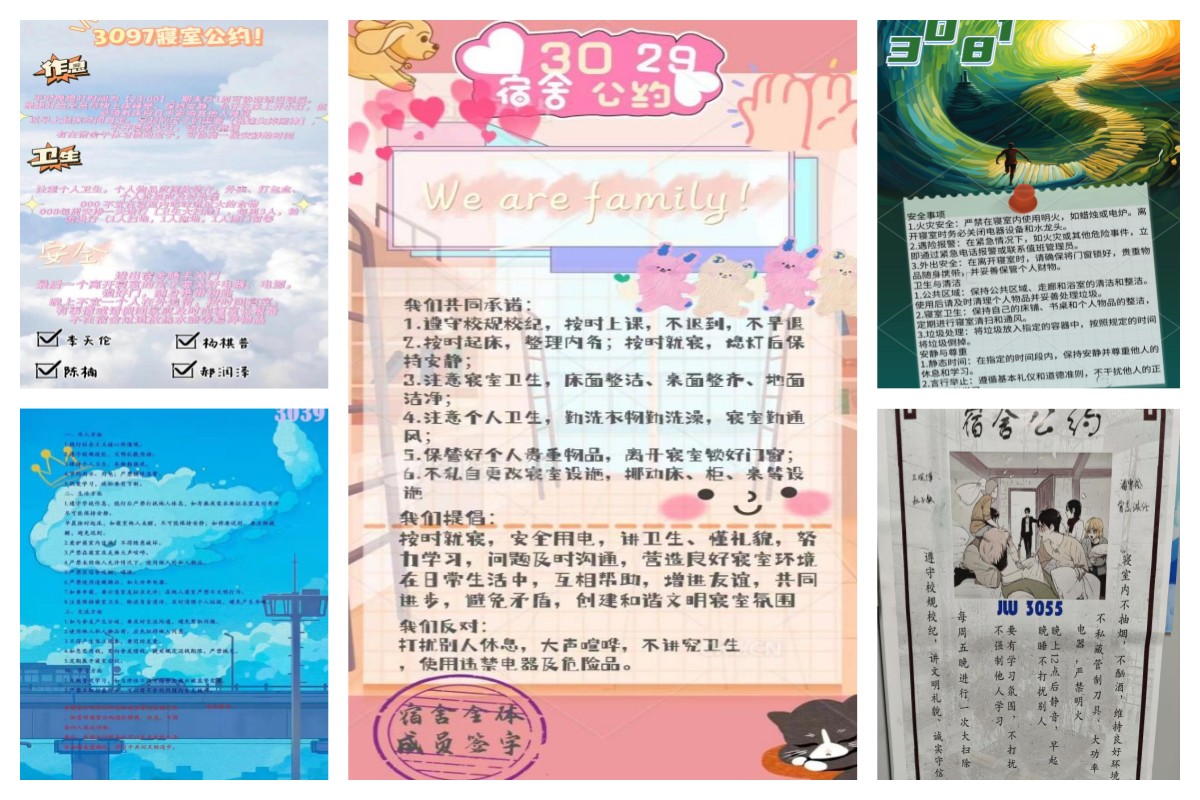 宿舍是同学们在校期间生活和学习的主要场所,来自天南海北的同学们可能有着不同的习惯和性格,干净整洁的环境、和谐温馨的氛围对于同学们体验多彩生活、高效学习工作、培养深厚友谊等具有重要作用。宿舍公约既是每位成员的行为准则,又是展示新时代老员工精神风貌的窗口。本次宿舍文明公约设计活动将文明修身与员工思想政治教育相结合、与校园文化建设相结合,为增进同学之间的相互了解和关怀提供了良好的契机,有利于引导员工加强自我约束、增强集体凝聚力。希望同学们以寝室为家,团结友爱,互帮互助,提升规范意识和责任意识,严格遵守寝室公约,共同营造安全健康、和谐温馨的宿舍文化氛围。
