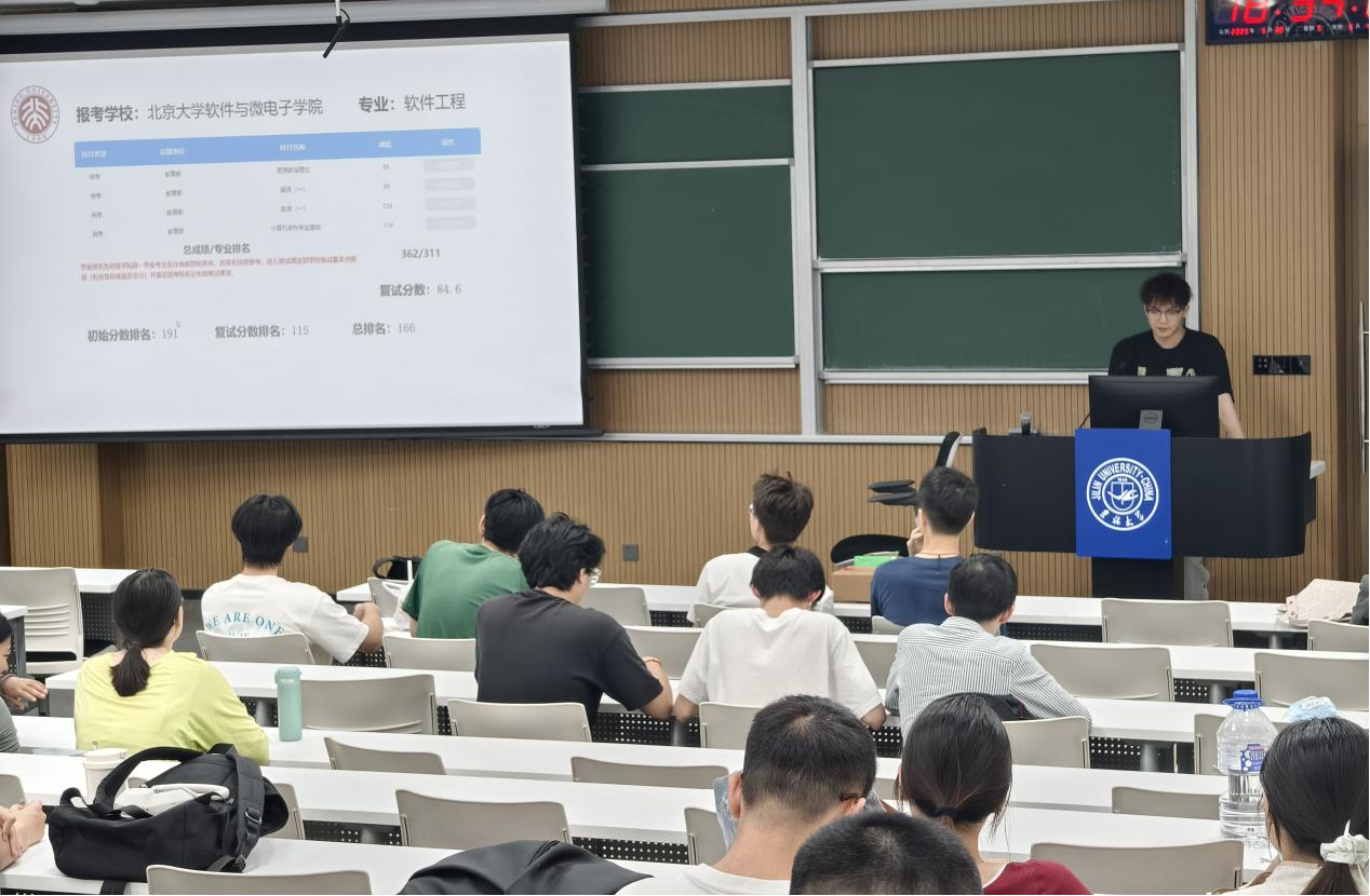 分享会上,已被北京大学录取的张浩学长以自身经历为例,即使本科成绩并不十分出色,同样可以通过科学的规划与踏实的复习圆梦考研。他以“数学是底线,408是上线,英语、政治保稳”为核心原则,展示自己整年的备考时间总览,重点强调了暑假是备考的关键时期。接下来,张浩学长围绕各个科目详细地进行分享,包括网课与参考用书推荐、复习阶段规划、学习顺序建议与备考心得总结。“数学在于理解,在于反复,做到思维上的尽量俯视”、“408的难度在于广度而非深度”等经验之谈令同学们印象深刻。他提醒大家要警惕假性努力的陷阱,与其纠结模拟卷分数,不如专注错题背后的知识漏洞,保持心态和节奏的稳定。