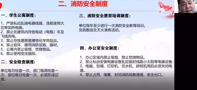 培训会上董老师首先介绍了做好消防安全工作的重大意义,强调员工公寓是人员密集场所,做好消防安全工作,预防和减少火灾事故非常重要。其次董老师介绍了具体的消防安全制度,并提出要持续加强消防 “检查消除火灾隐患能力”、“扑救初期火灾能力”、“组织疏散逃生能力”“消防宣传教育能力”建设。随后,董老师列举了多个触目惊心的火灾案例,用鲜明的案例警醒师生要时刻将消防安全谨记心中。董老师又详细介绍了在员工公寓内使用电器的注意事项,如不要私接线路、不要使用不合格的电子产品、不要使用大功率电器、在一个插排上不要连接过多电器、不要长期使用某一个插排、不要长时间充电电子设备等,强调不要在宿舍内存放易燃易爆物品。最后,介绍了灭火器材的使用方法及逃生方法。